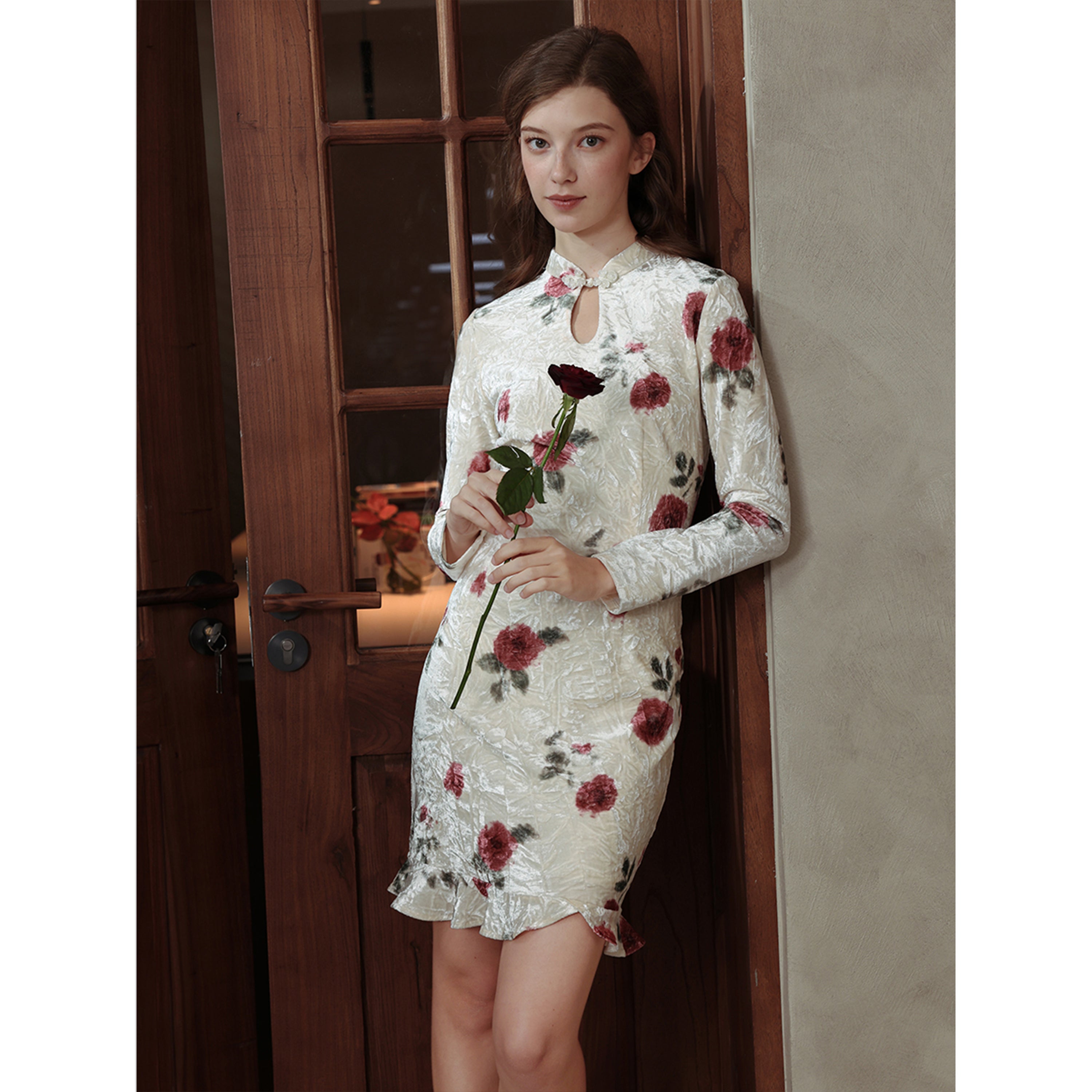 Stretch Velvet Cheongsam Dress with Rose Print