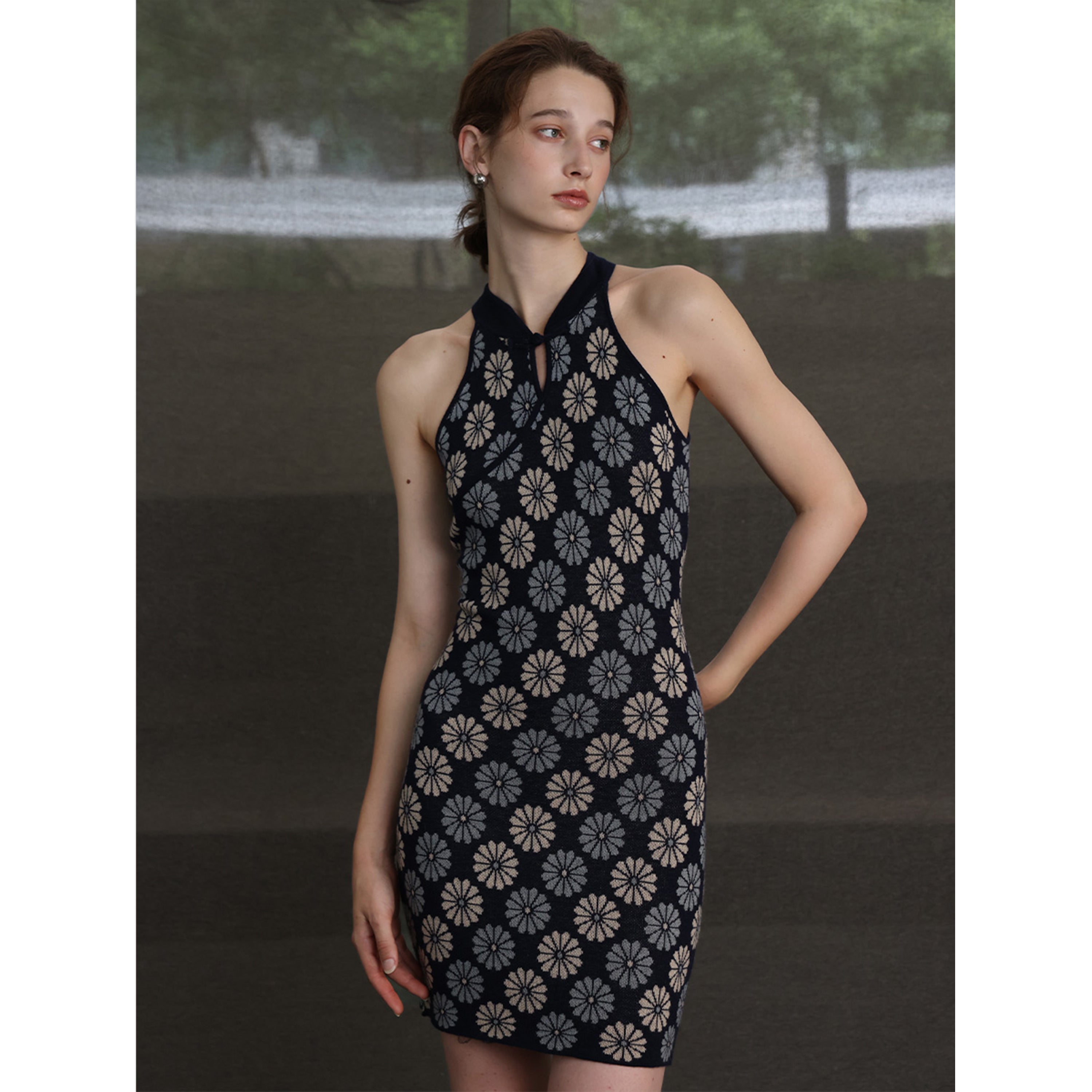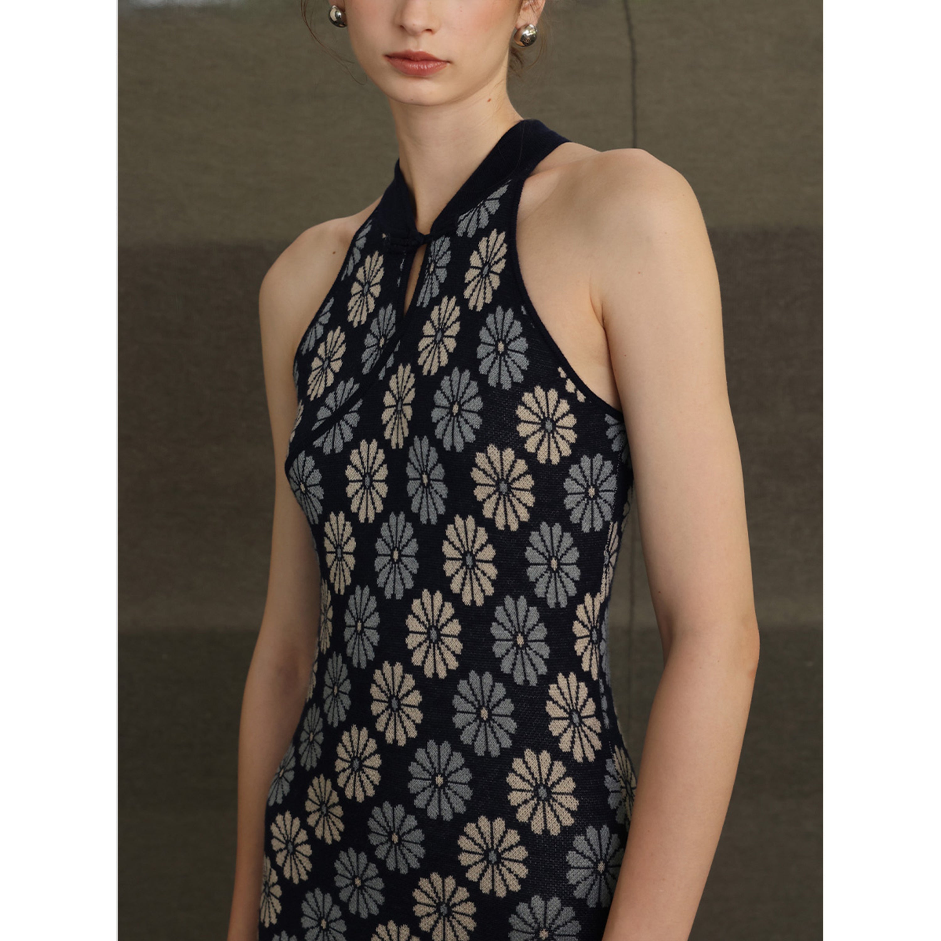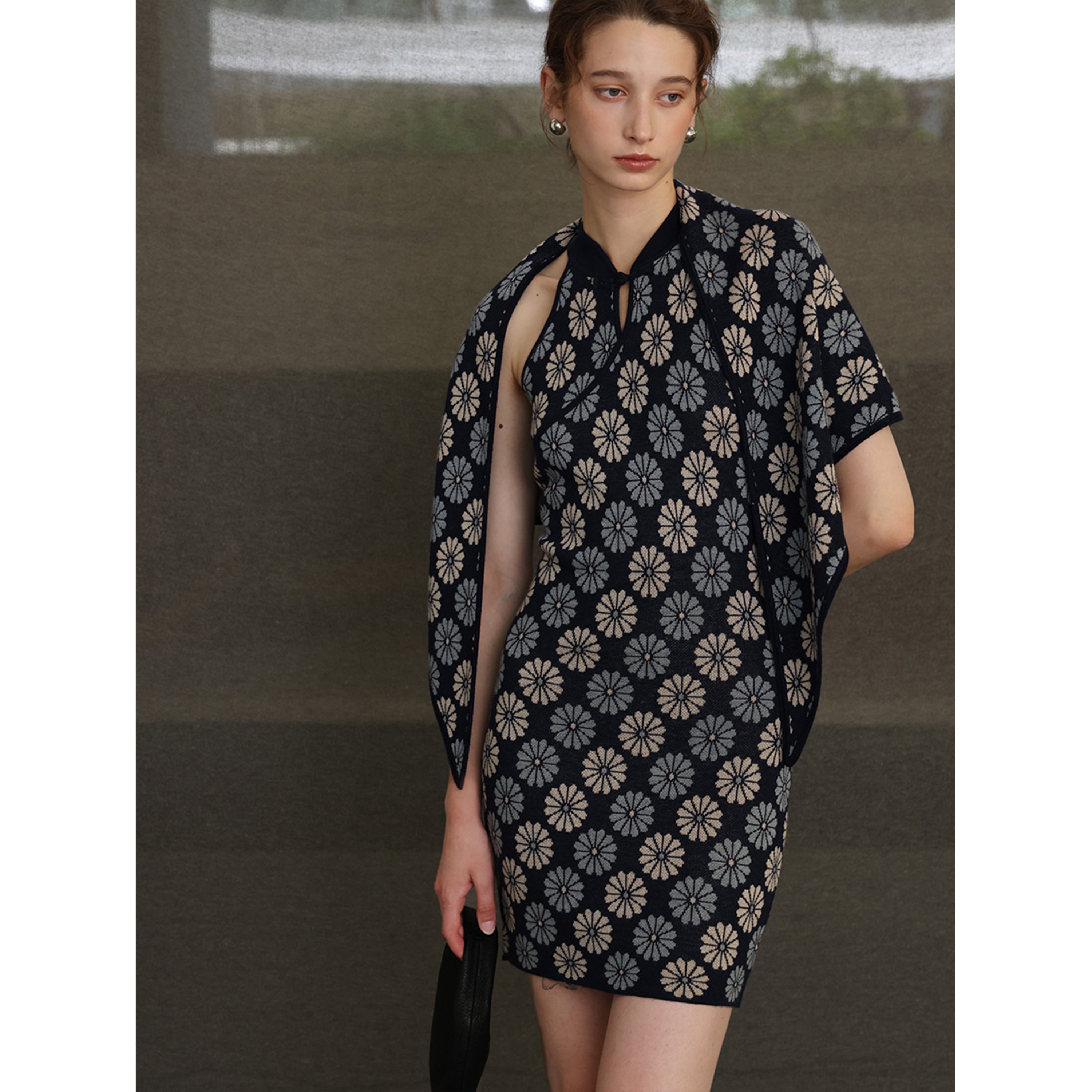 Qipao Rajut Jacquard Modern + Syal Jacquard Motif Bunga Daisy yang Sama