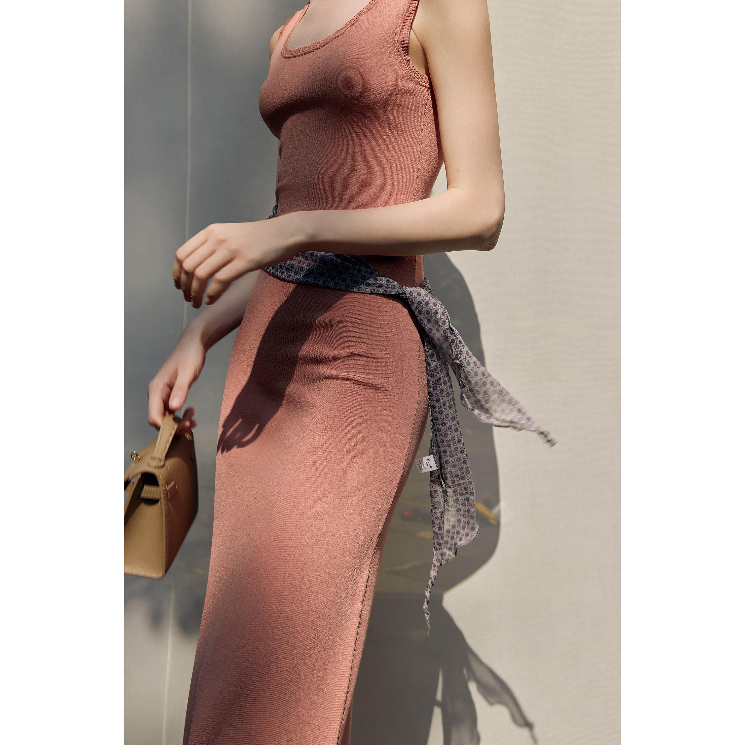 The dress showcases meticulous craftsmanship with ribbed edges on the neckline and armholes, preventing rolling and ensuring a polished appearance. These details enhance its overall aesthetic, offering a refined and sophisticated look.