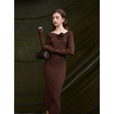 Floral-Ruching Off-Shoulder Knit Dress - Worsted Wool Blend