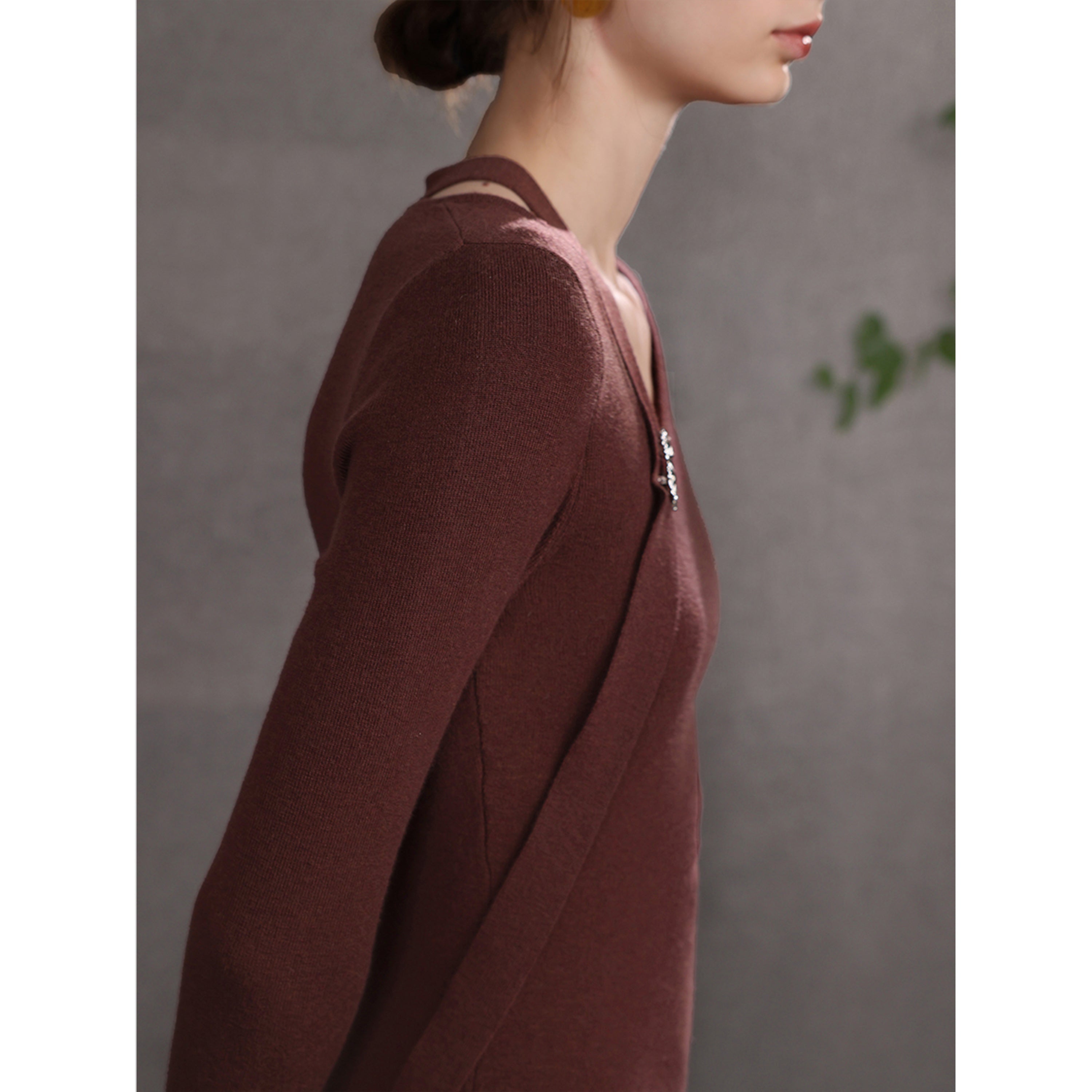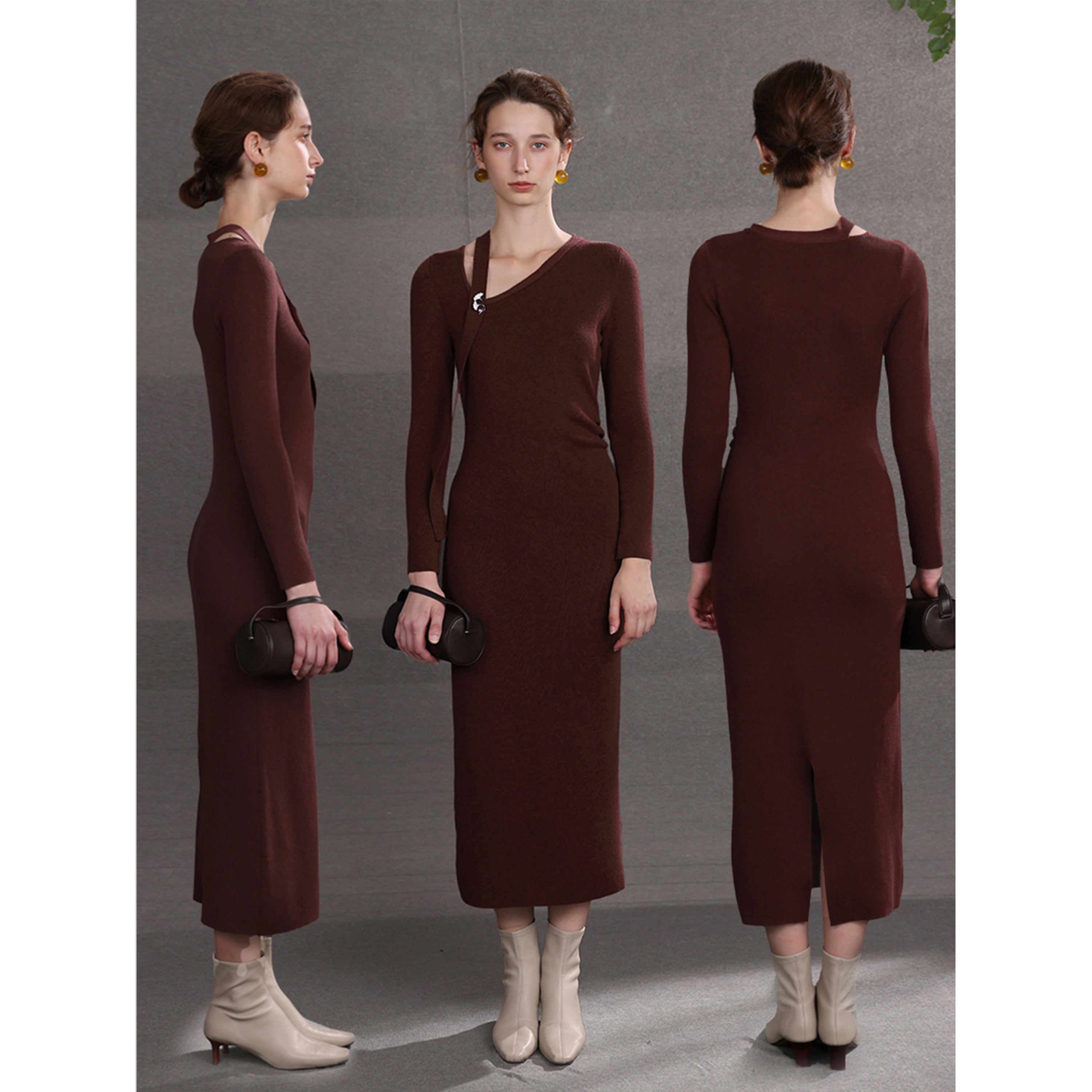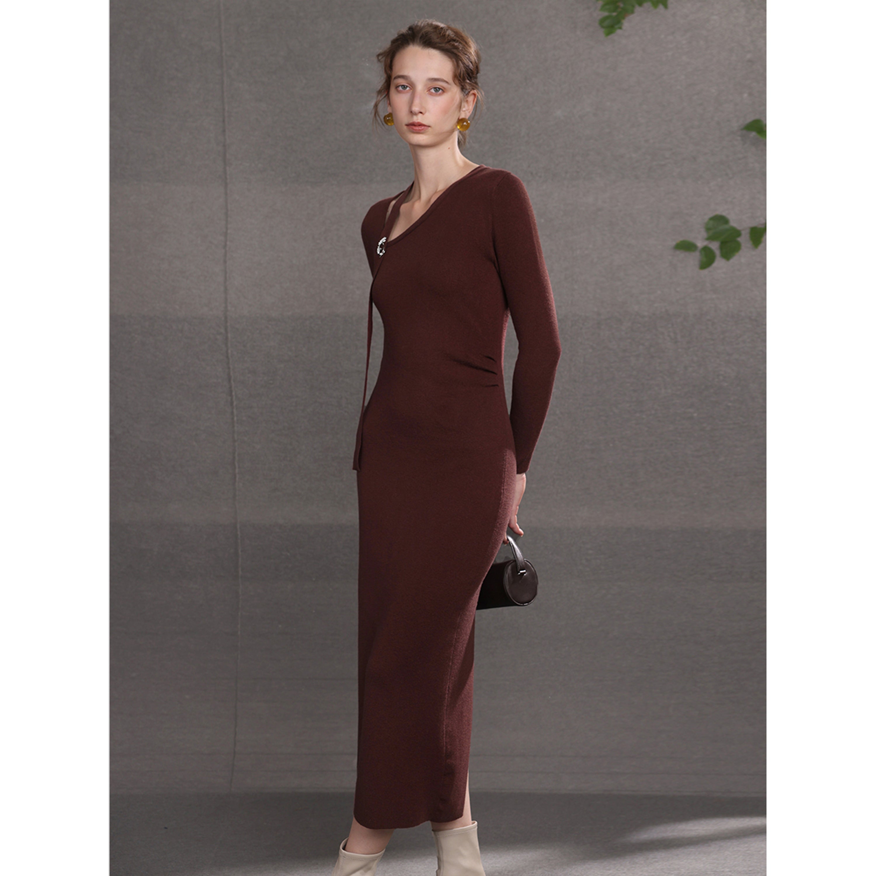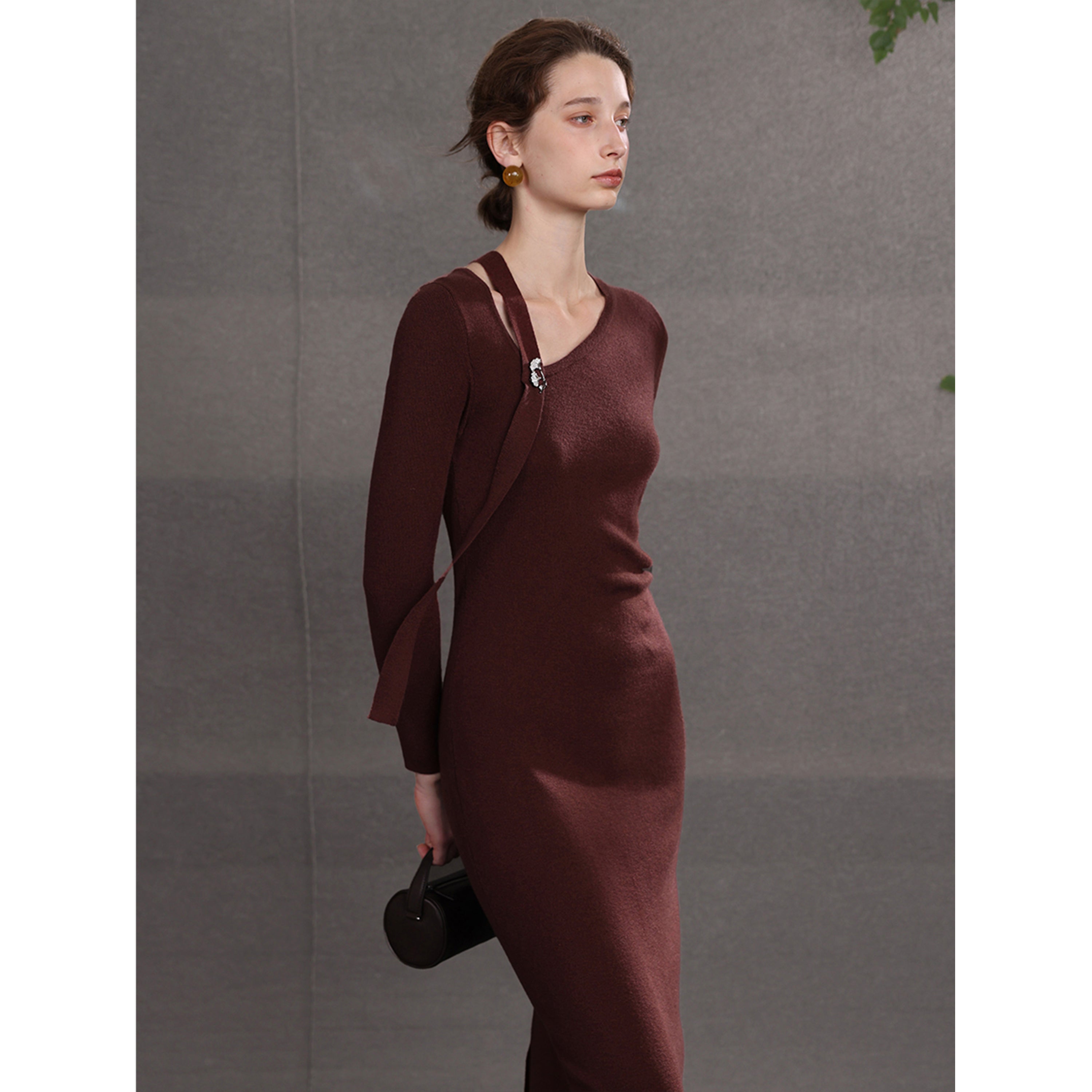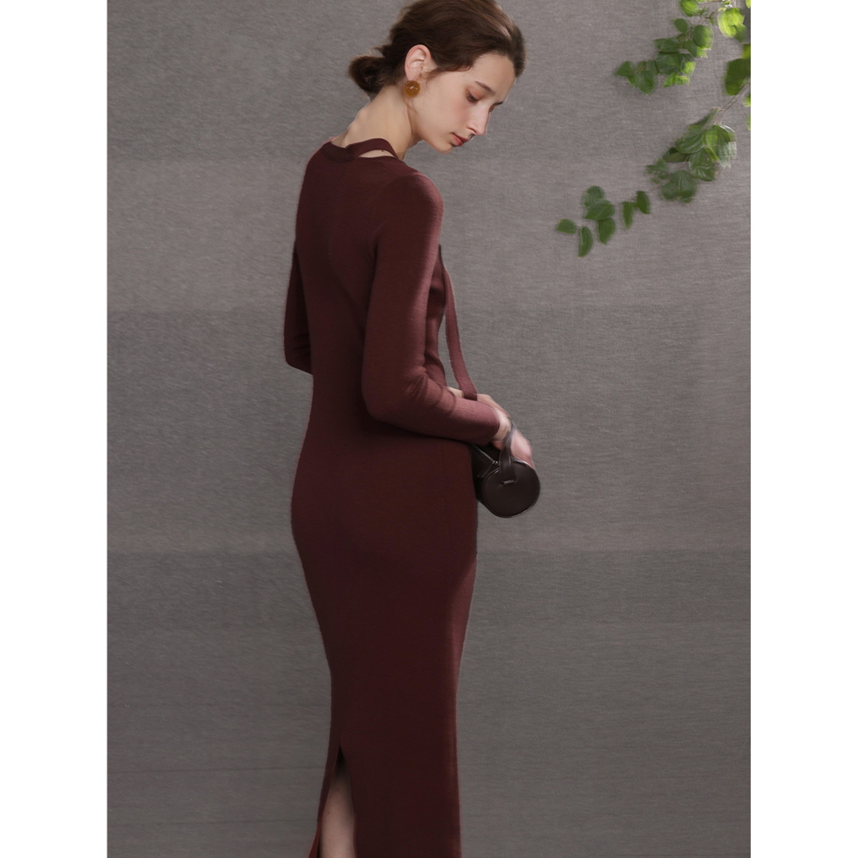 Soft Worsted Wool Slim Dress with Ribbon Tie
