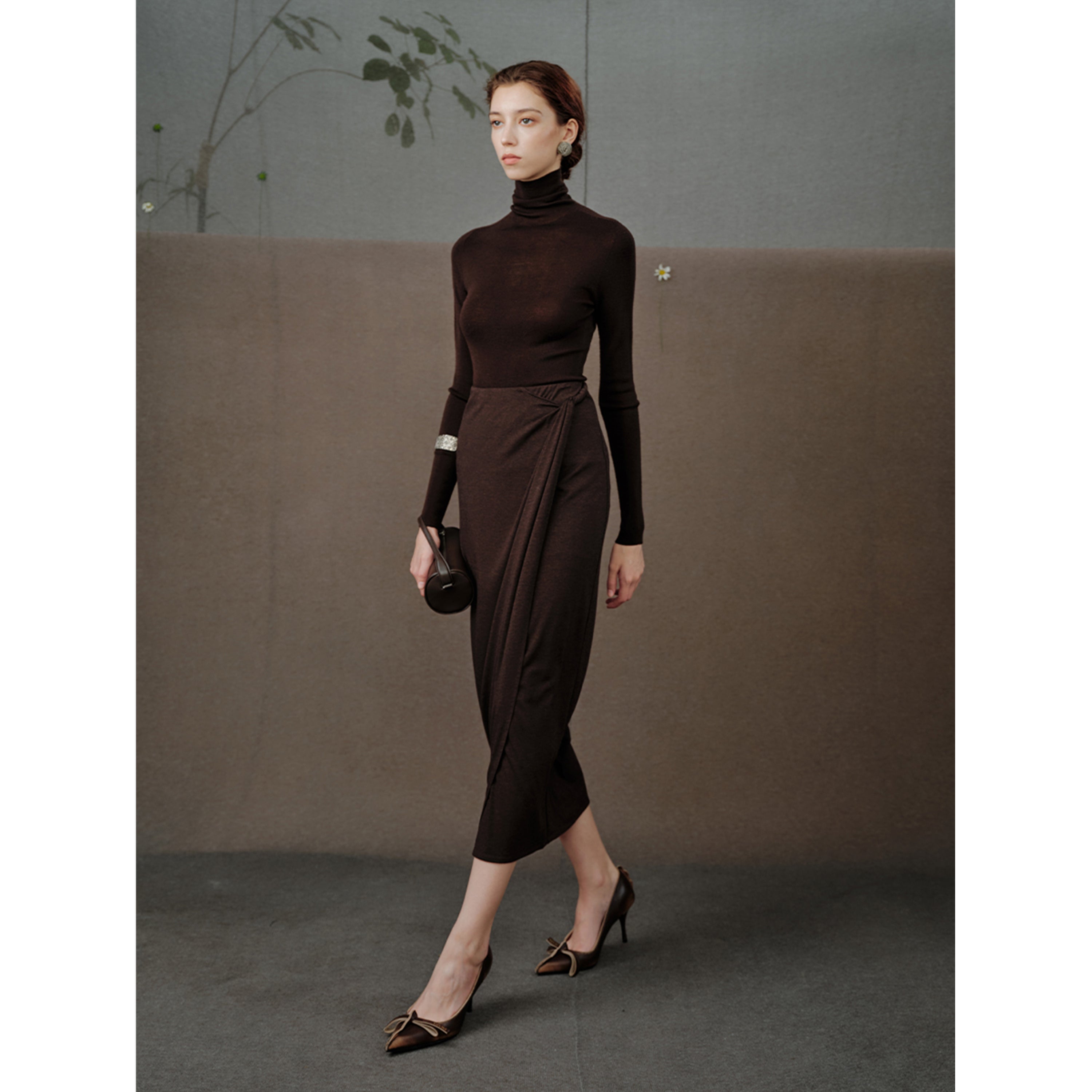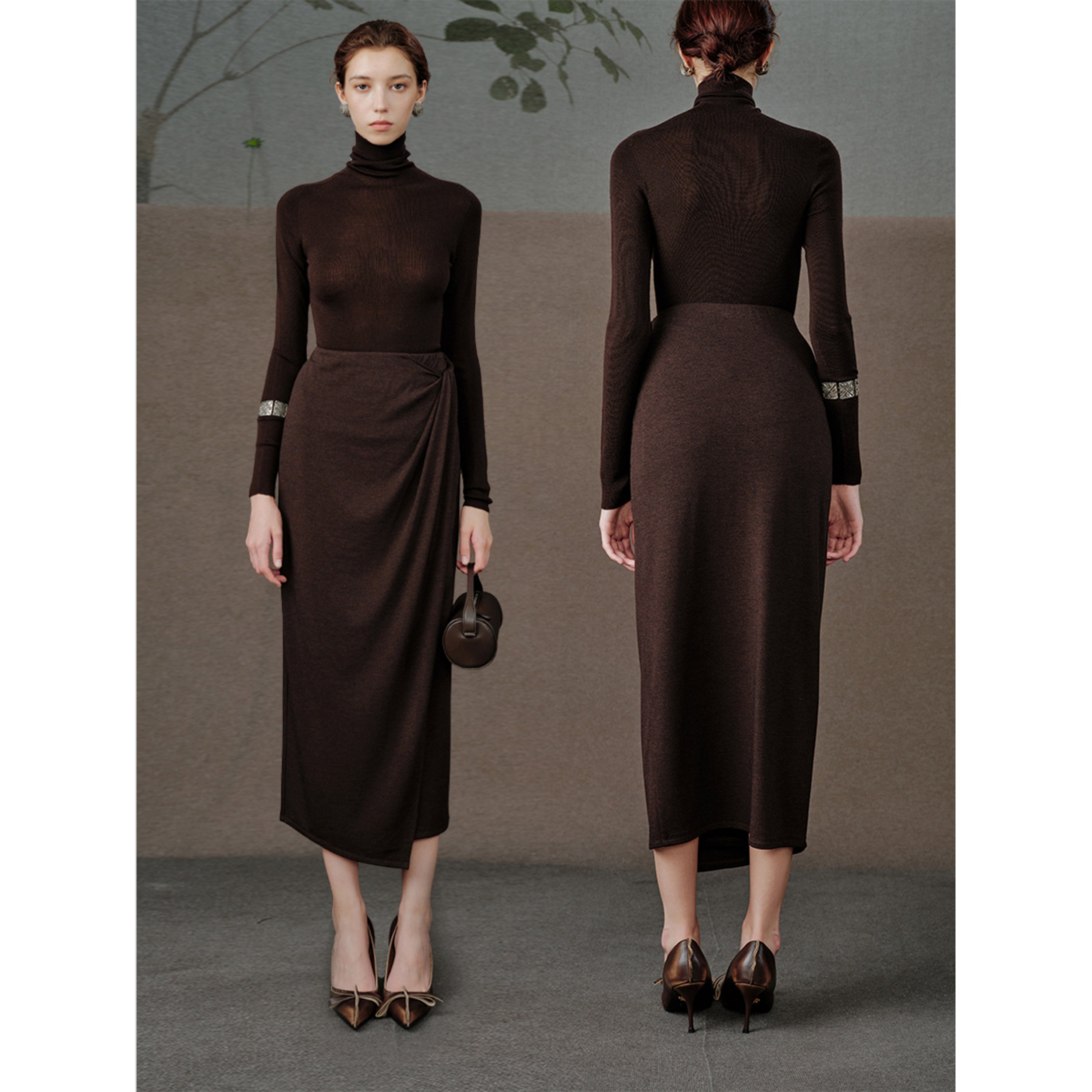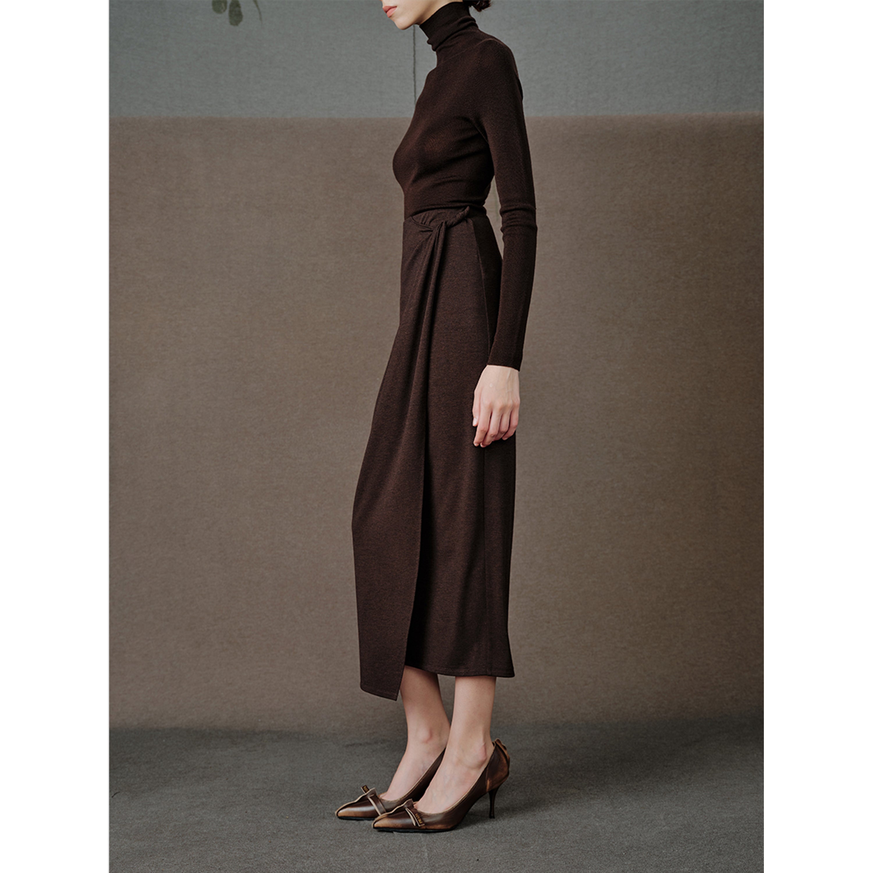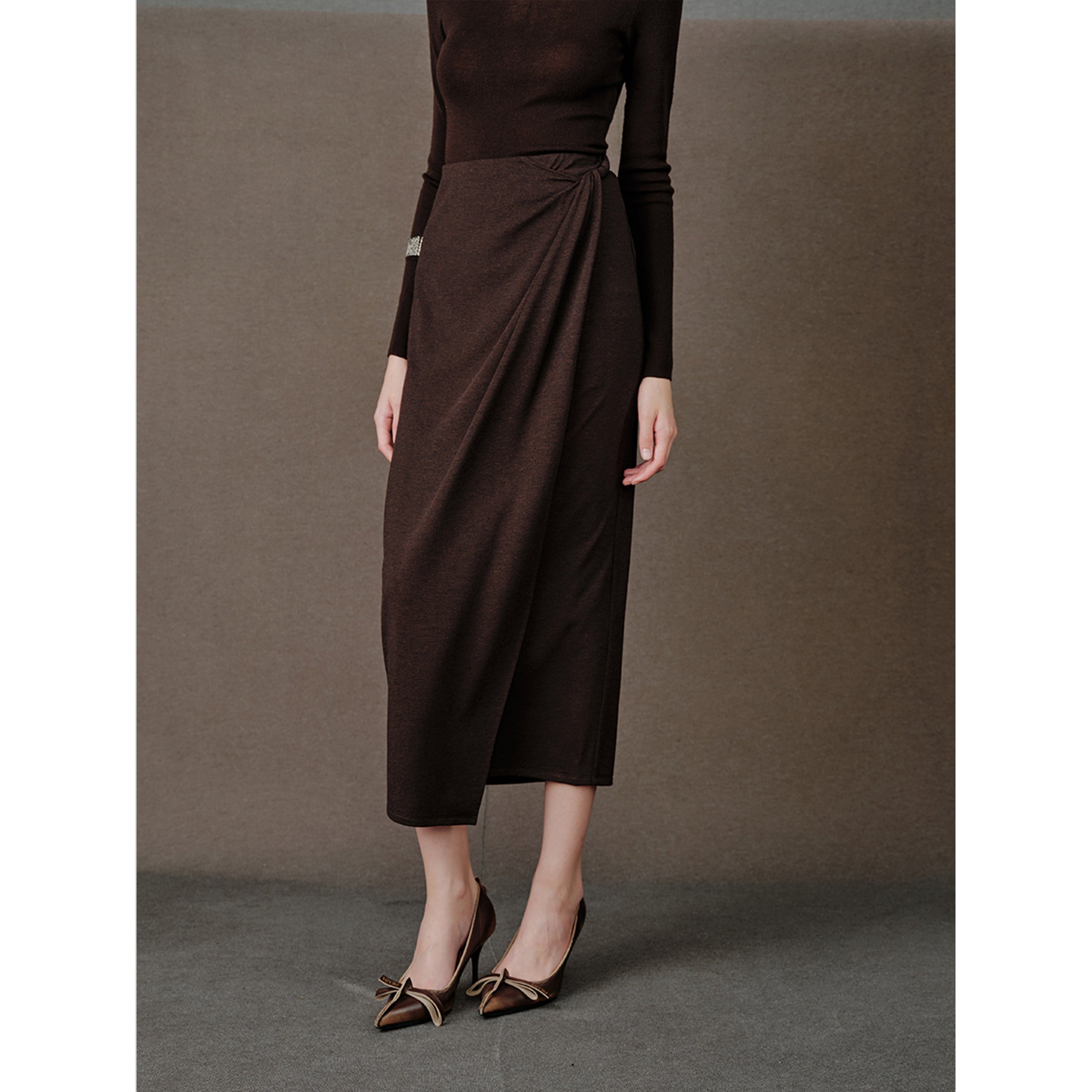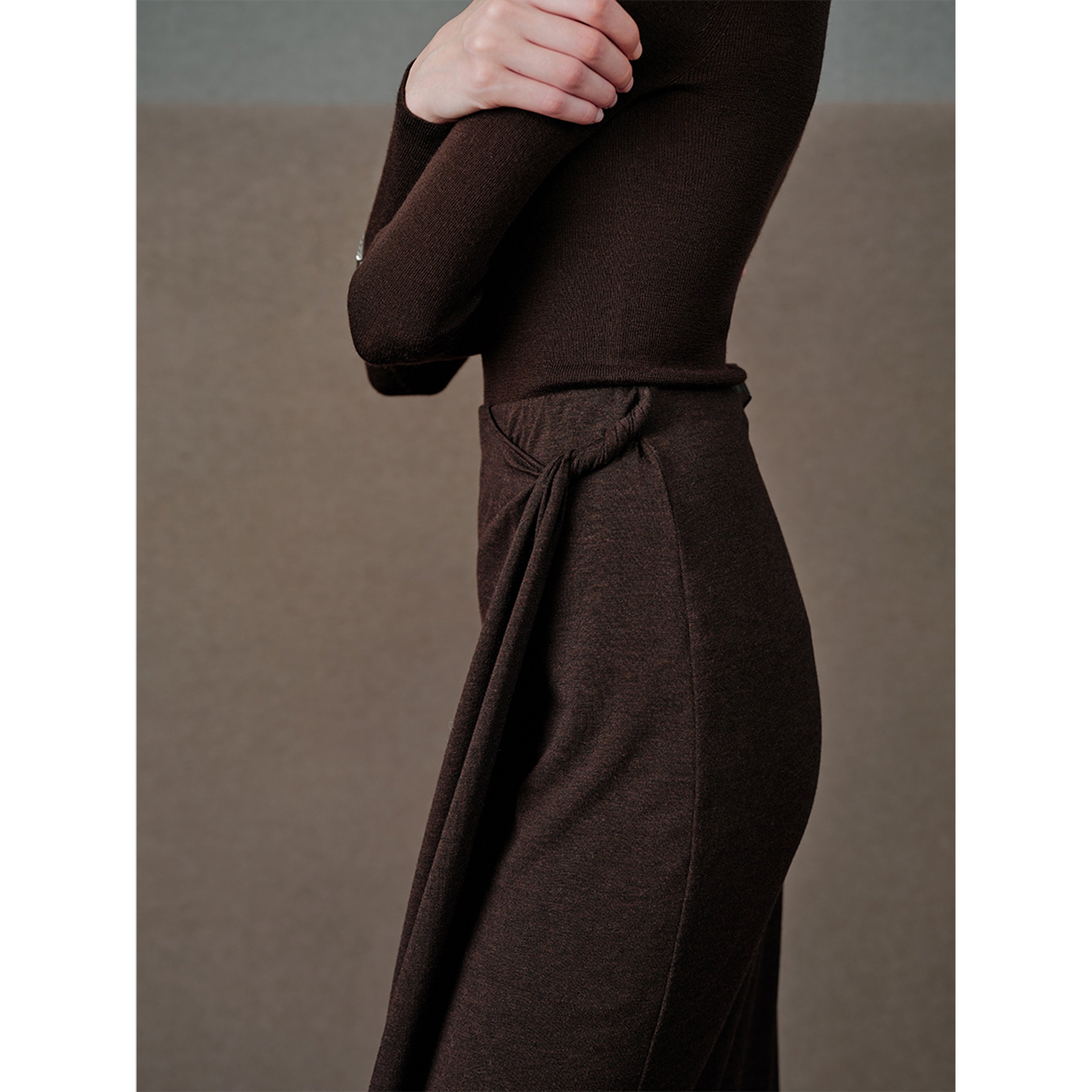 Figure-Sculpting: Draped, knotted waist detail subtly defines curves within a refined pencil silhouette.
