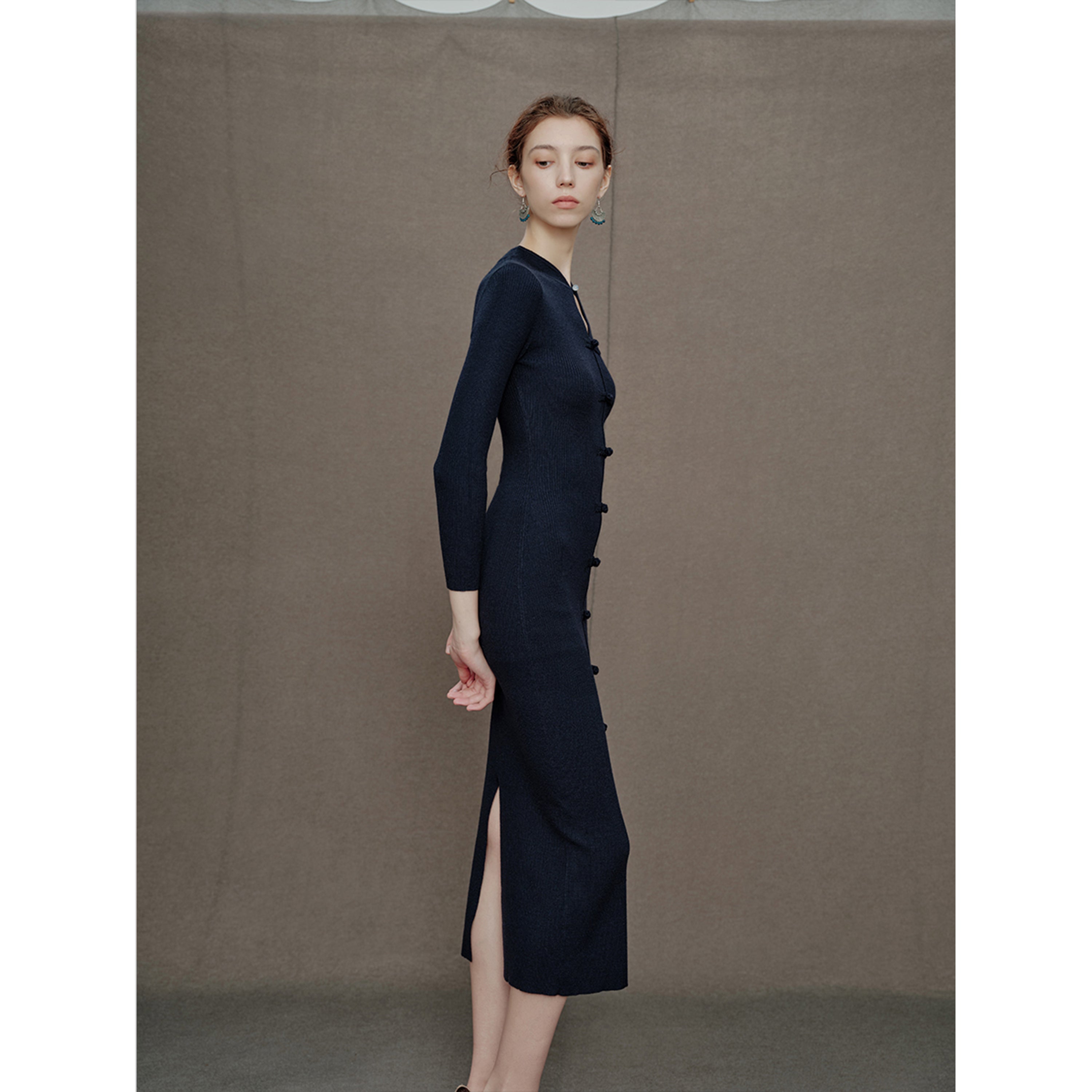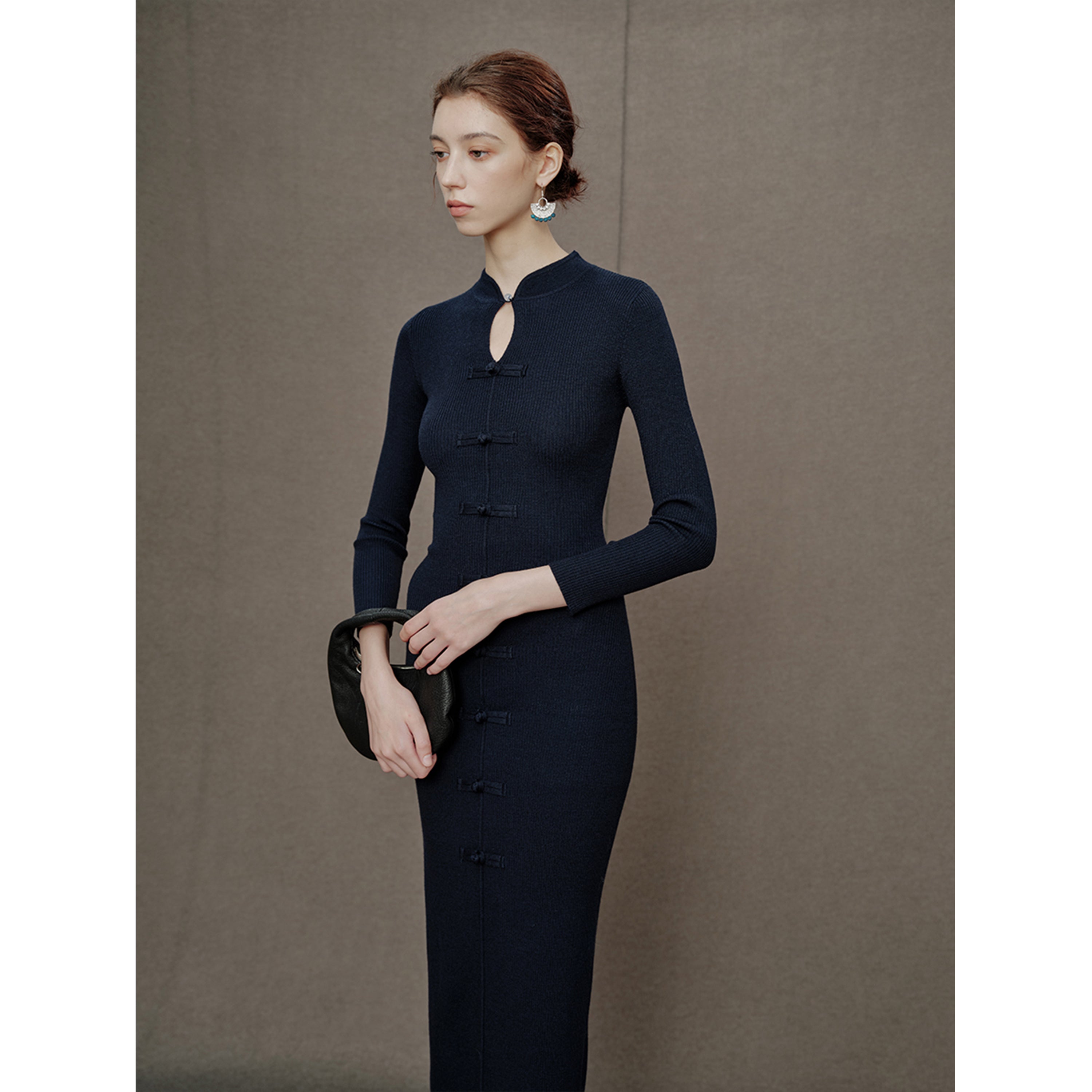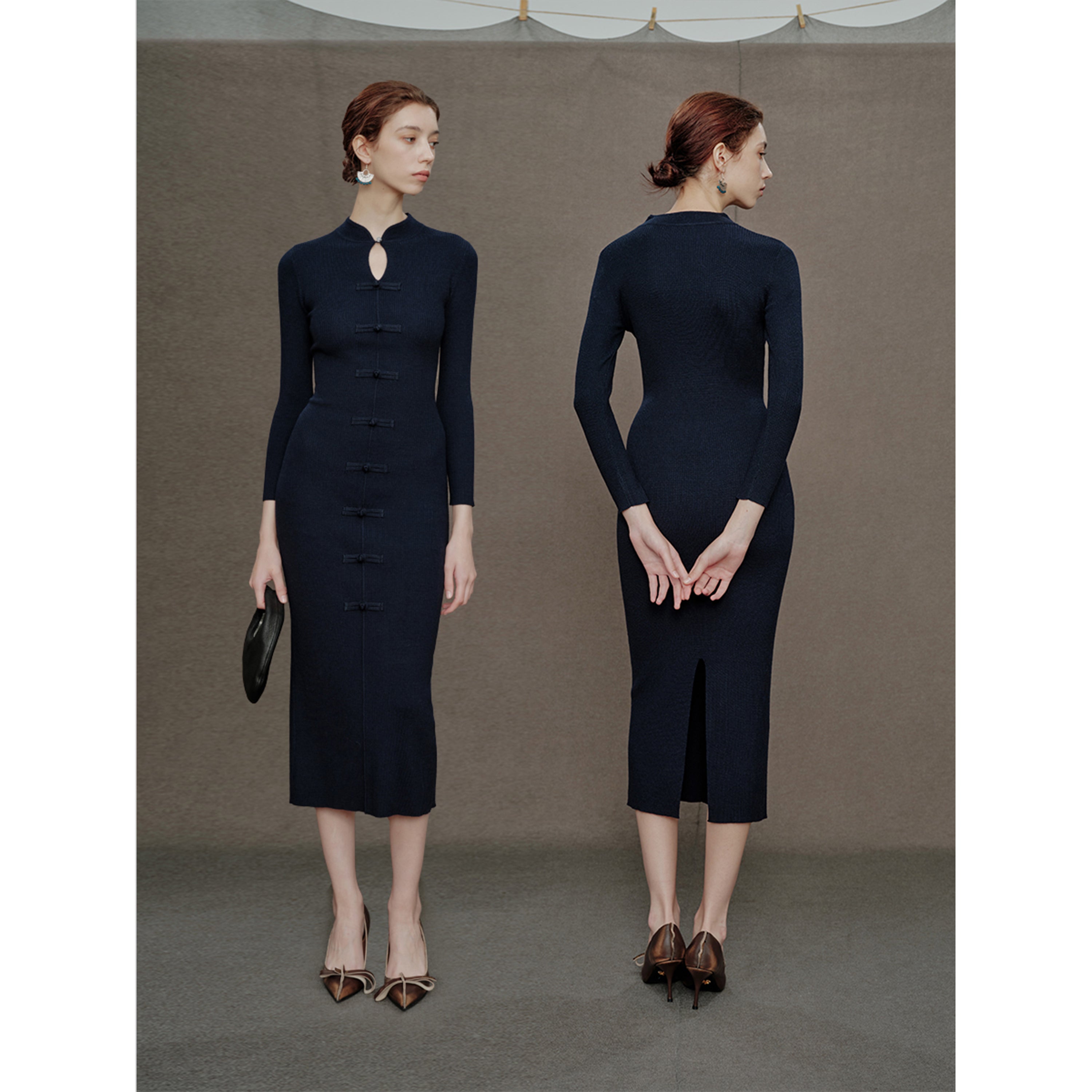 Modern Qipao Knit Dress – Easy-Care Machine-Washable Wool with Acrylic Blend