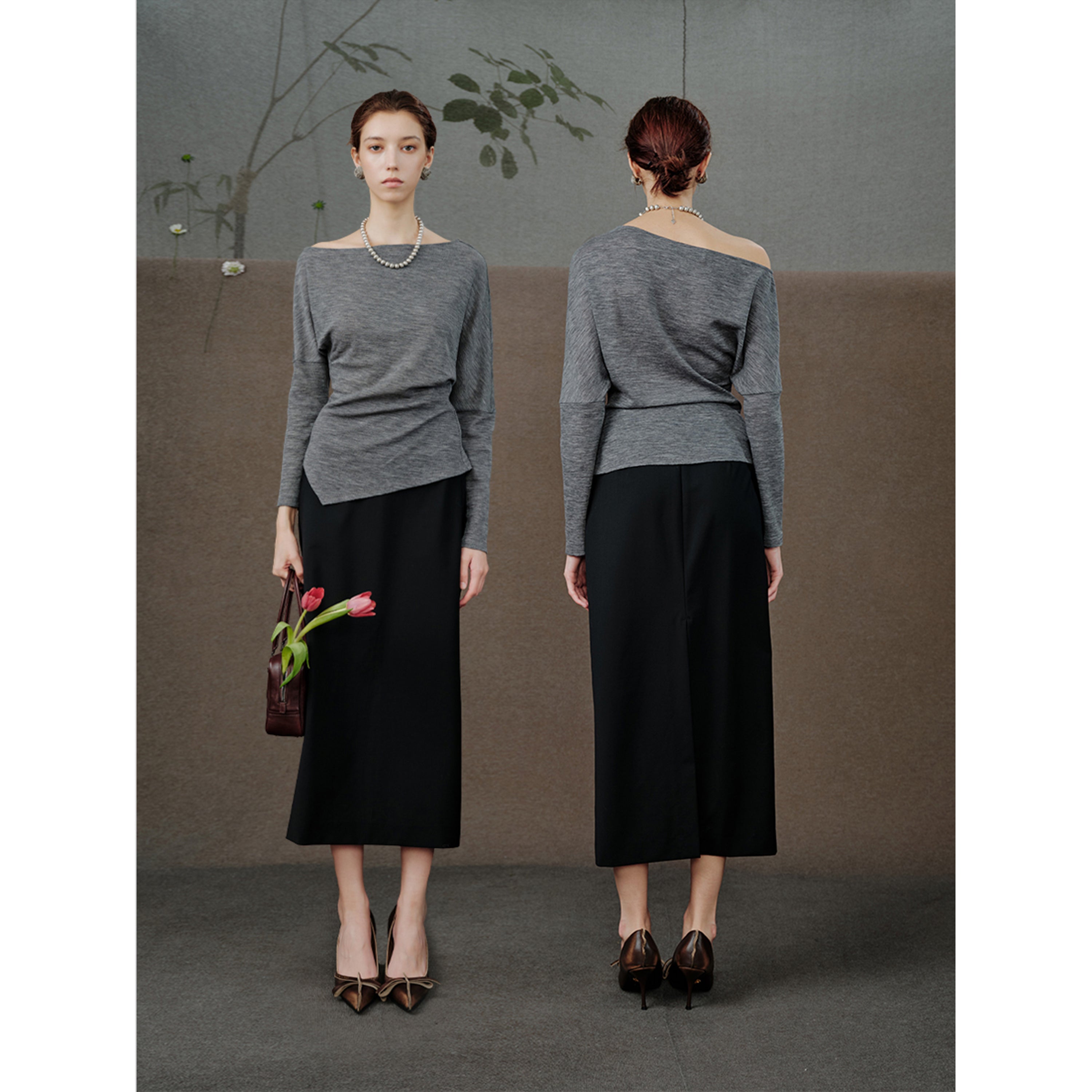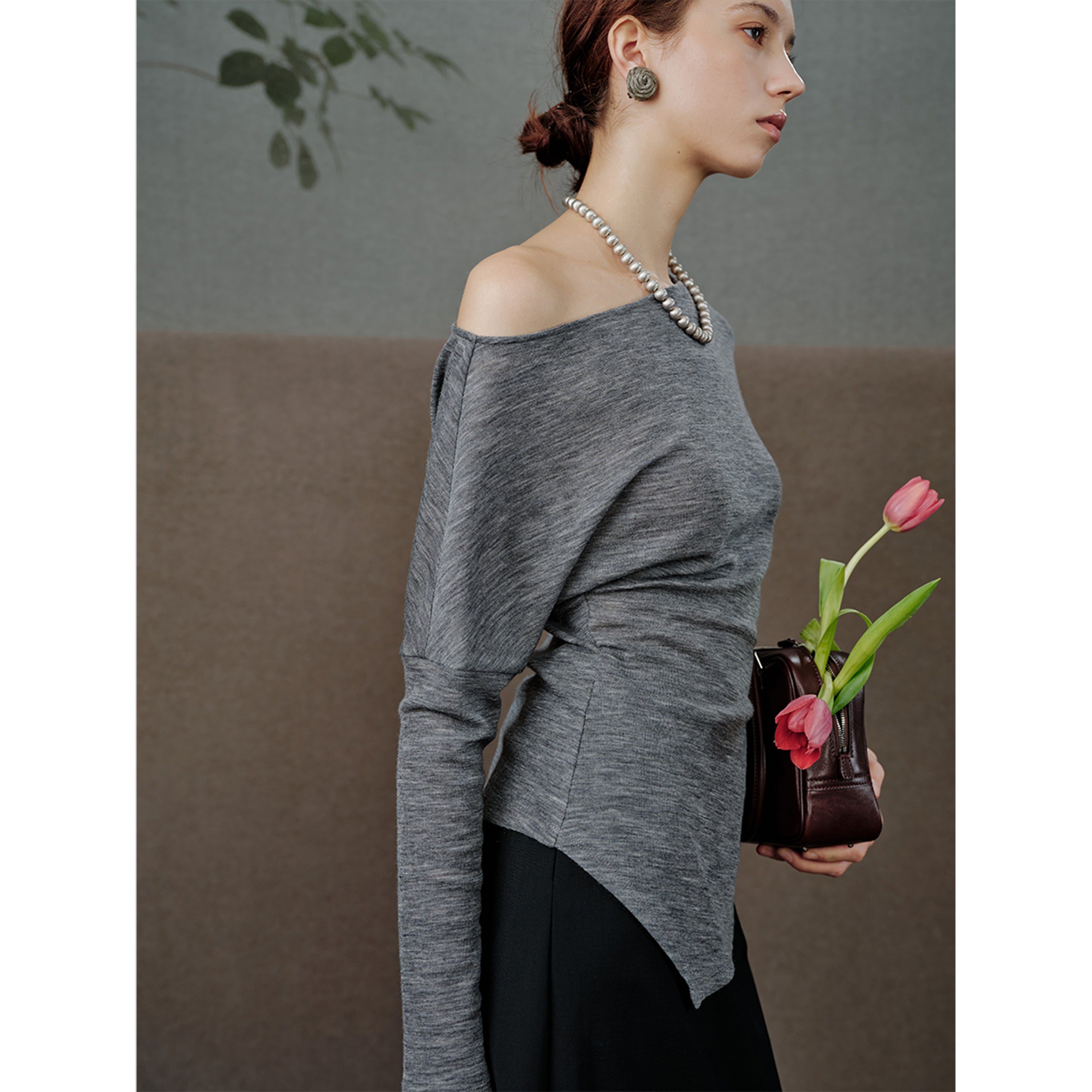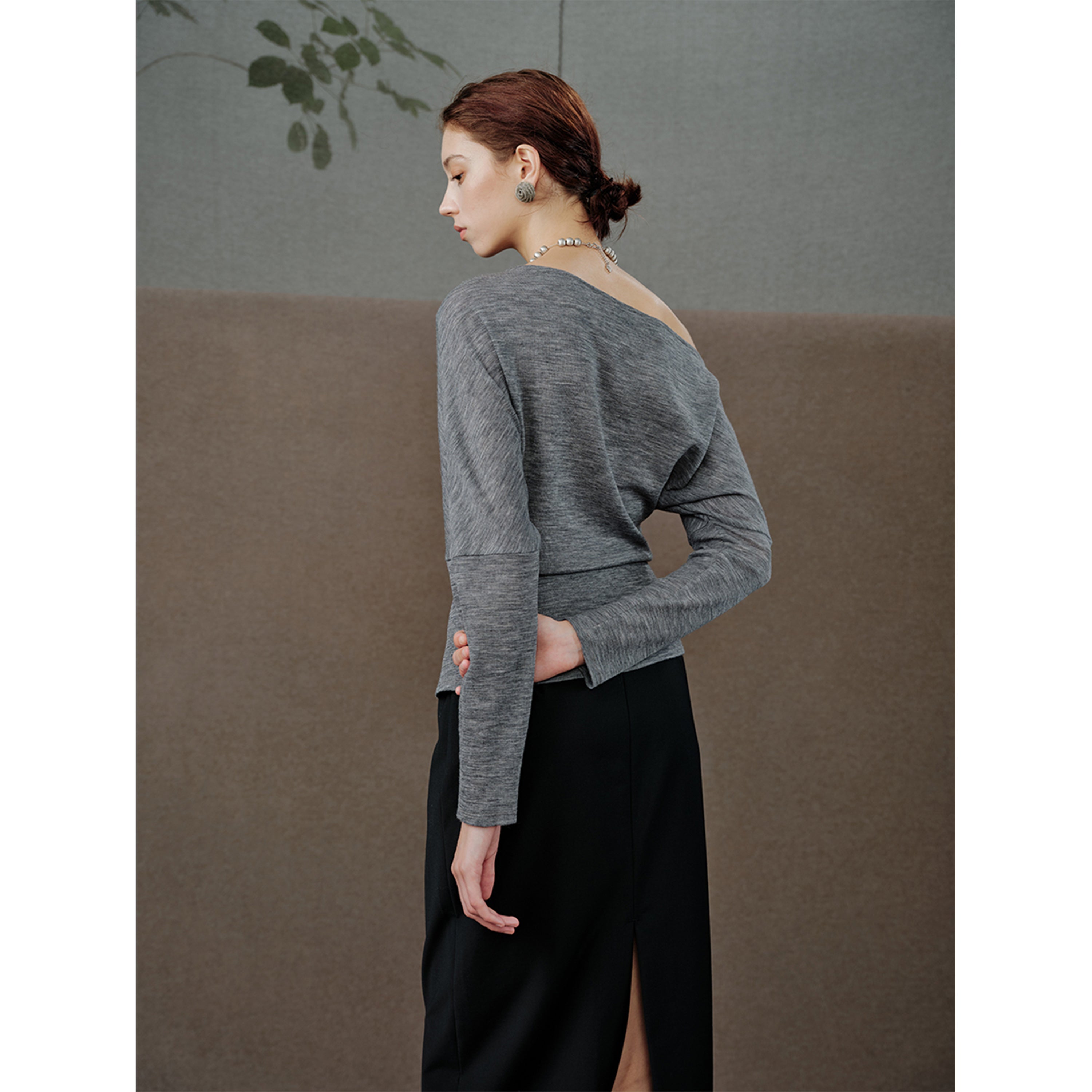 Item No.: MSCJY0826 Neckline: One-shoulder/ Boat Neck Sleeve Length: Long Sleeve Fit Type: Slim Fit Yarn: Ultra-fine 18.5μm Merino wool Yarn Design Details: Batwing Sleeve Design