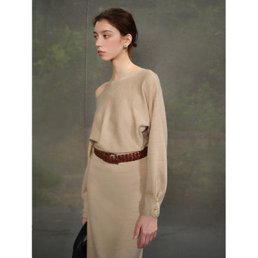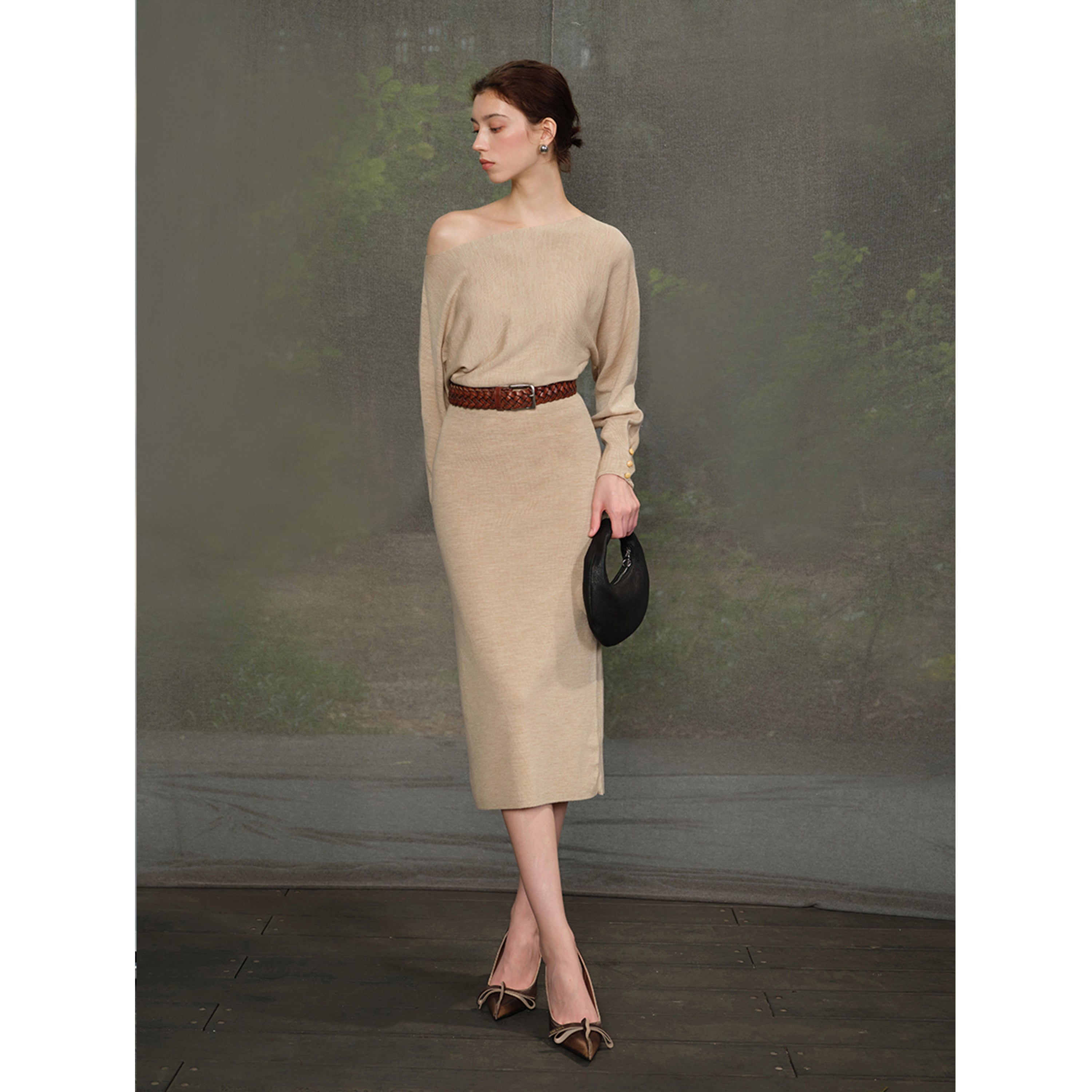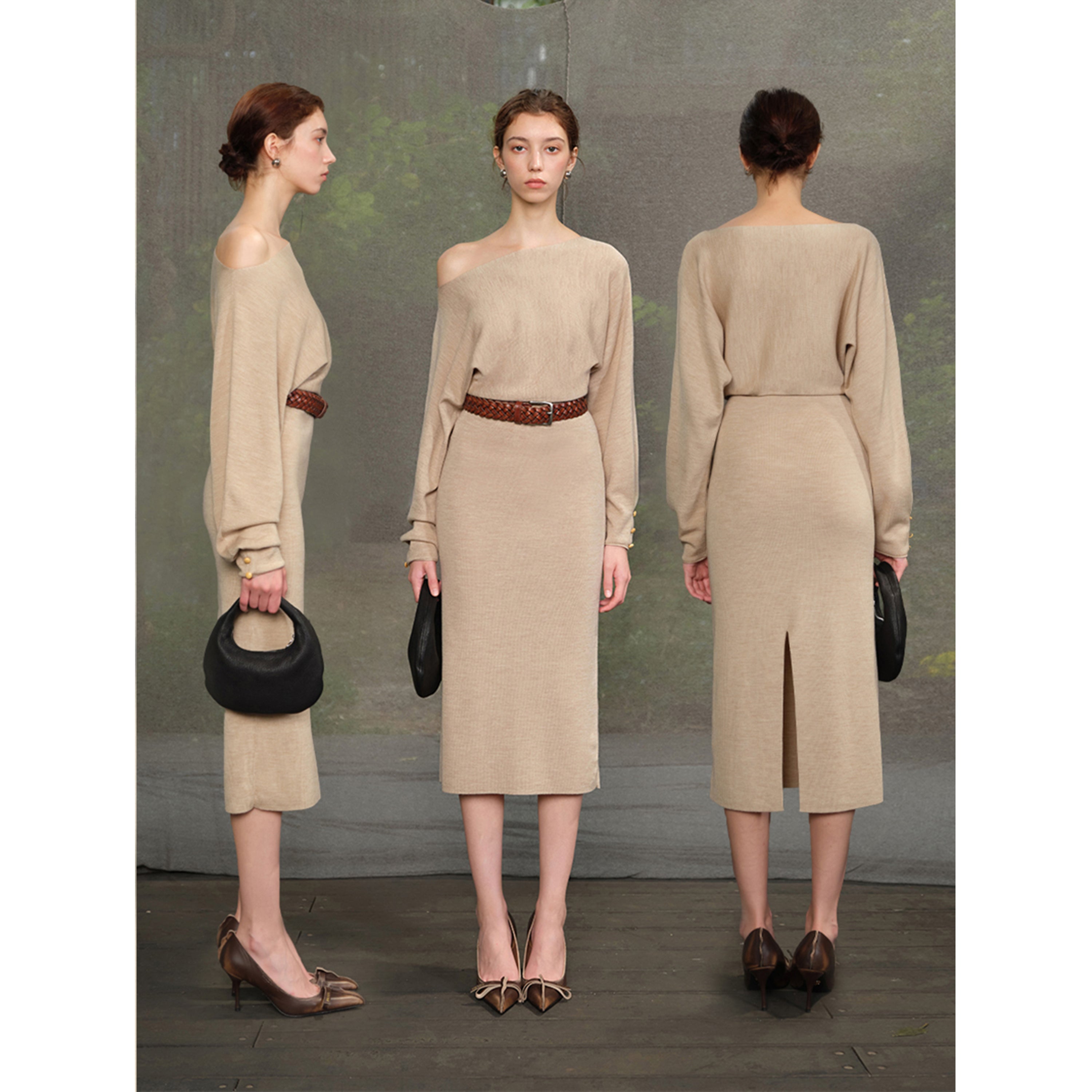 Sophisticated Silhouette: The off-shoulder neckline and slim, straight midi skirt strike a balance between comfort and elegance—ideal for dinner or the office.