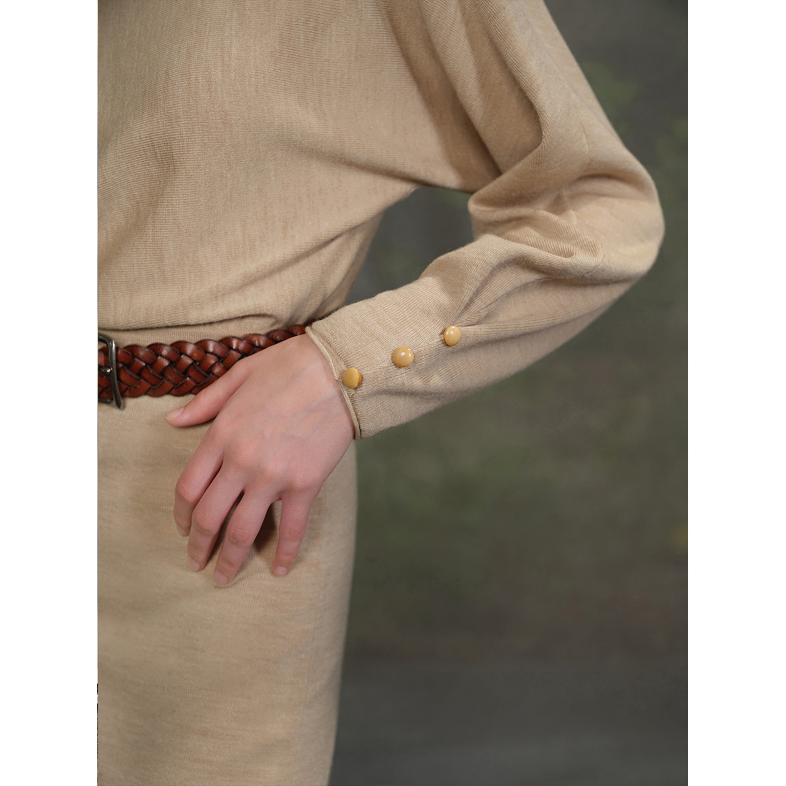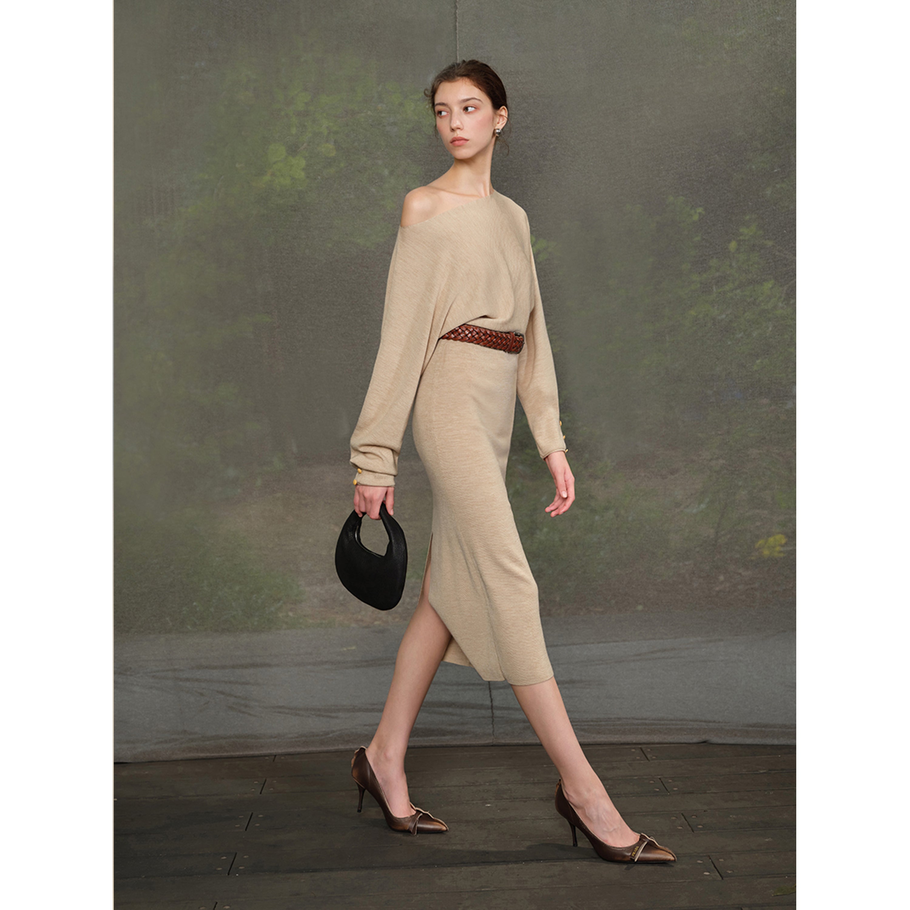 Item No.: MSCJQ0742Neckline: Off-shoulder necklineSleeve Length: Long Sleeve |Dress Length:Midi DressFit Type: Slim Fit Yarn: 60 NM Superfine Merino Wool Blend YarnDesign Details: Off-shoulder Neckline and Same-color Buttons At Cuffs