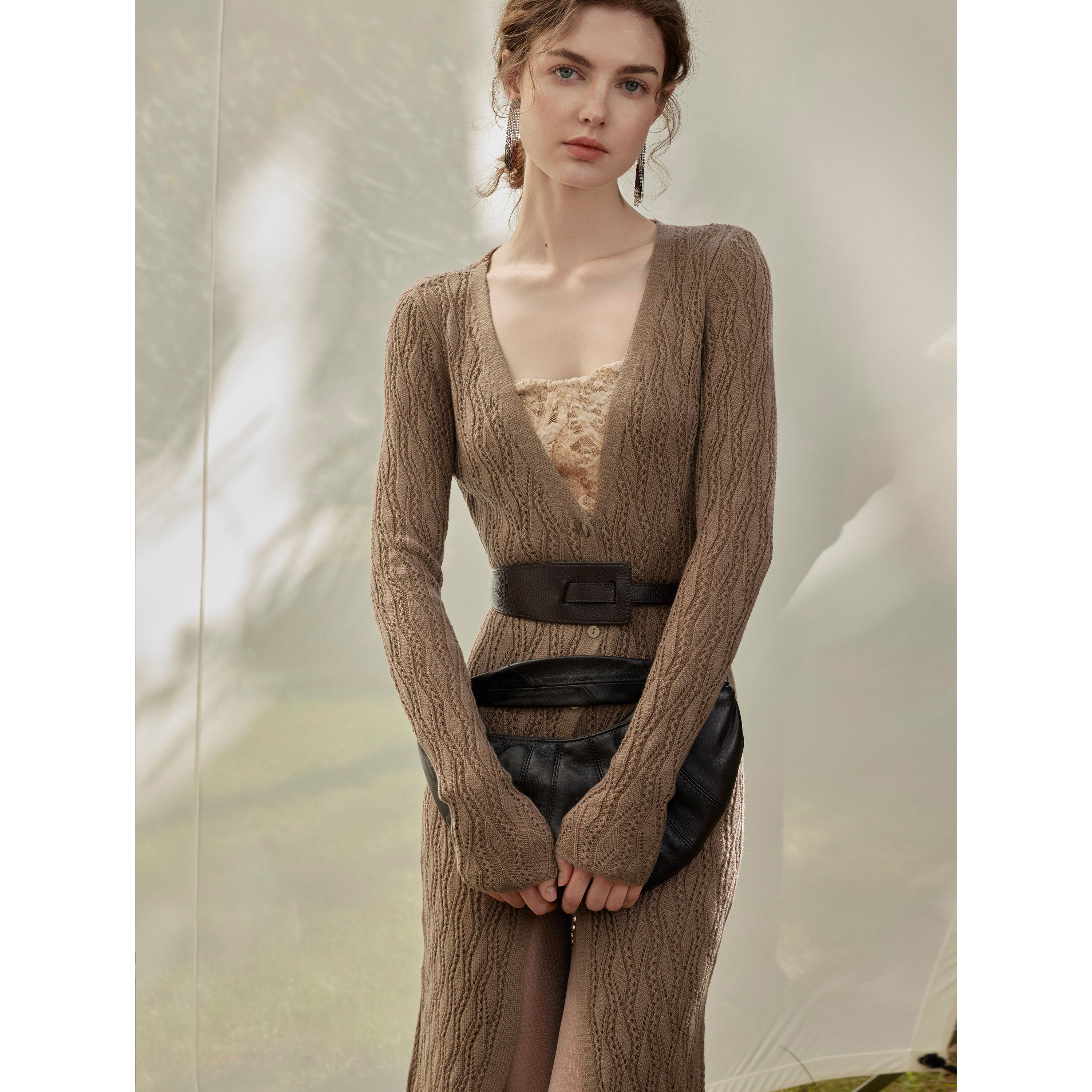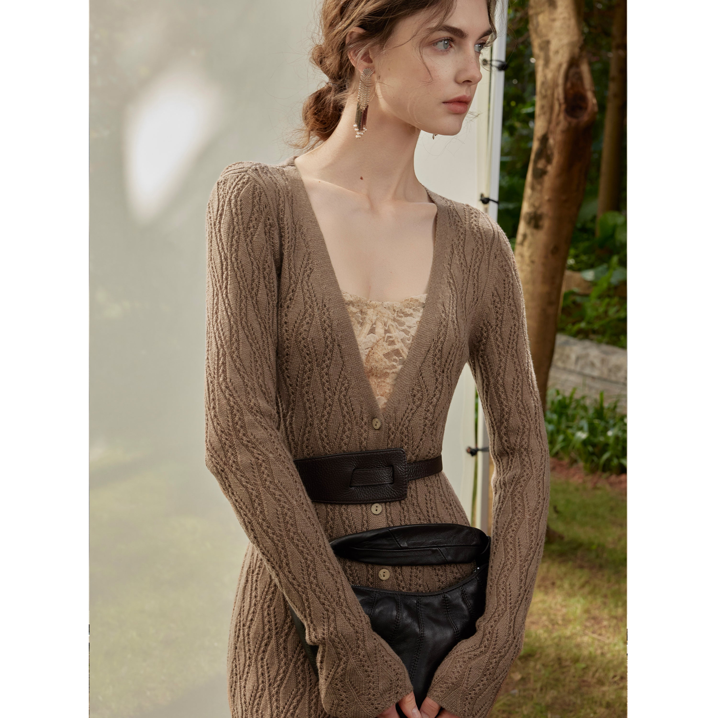 Versatile V-Neck Button Style – Wooden buttons add a natural touch; wear closed as a curve-hugging dress or open as a chic cardigan.